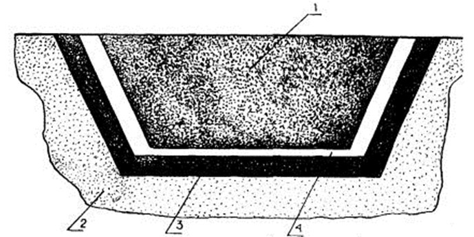 1 - отходы ТБО; 2 - грунт; 3 - экран (ГСН-1 в георешётке); 4 - защита экрана (природный грунт-суглинки толщина 300-500мм)